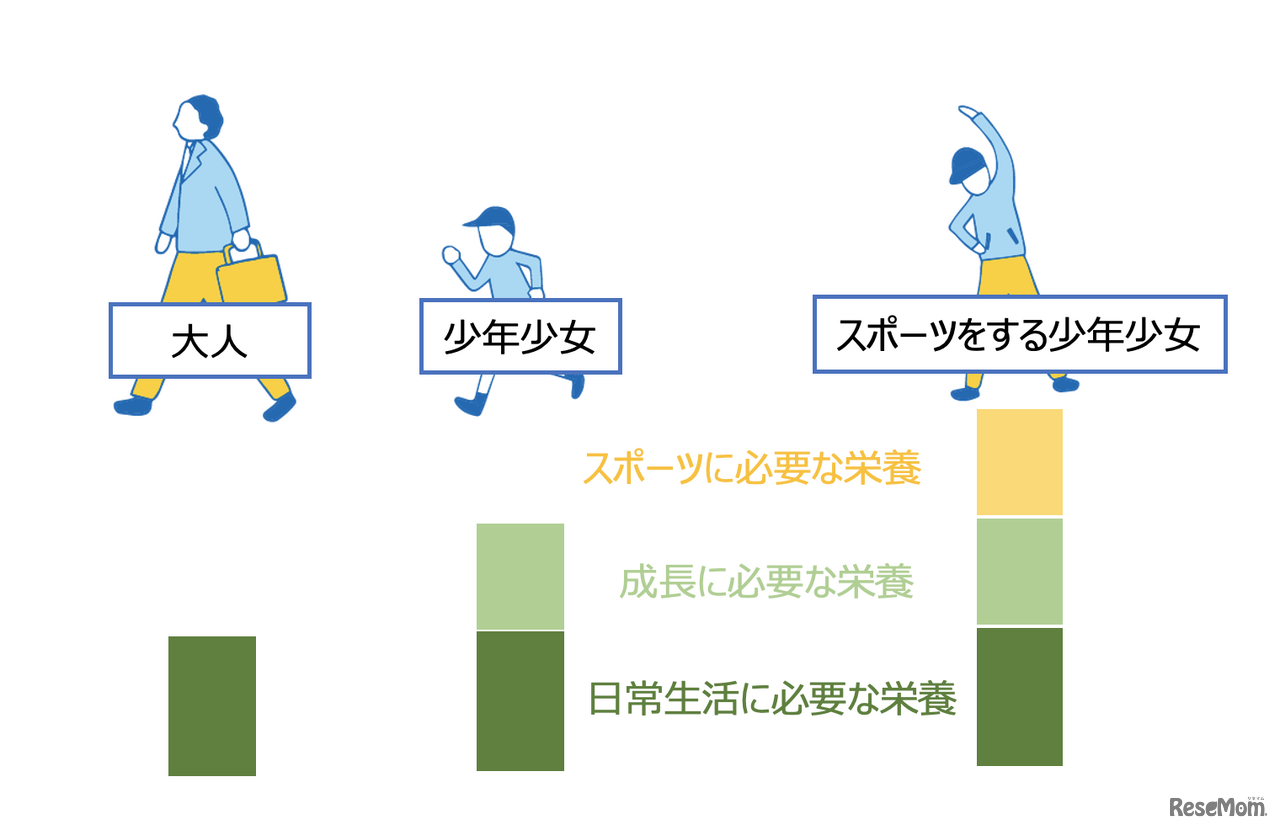(貴田氏からの提供資料をもとに編集部にて作成) 子供に応じて成長に必要な栄養、スポーツをするために必要な栄養をプラス