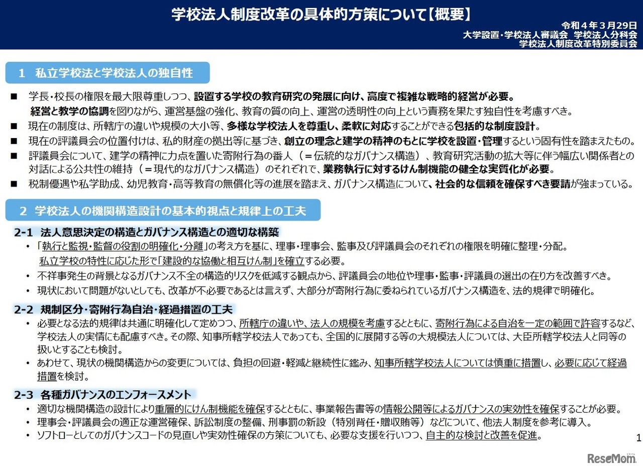 文部科学省は2022年3月29日、「学校法人制度改革特別委員会報告書」を公表した。これまでの不祥事事案を踏まえ、学校法人のガバナンス(統治)改革を進めるため、評議員会のチェック機能強化等、具体的方策をまとめている。