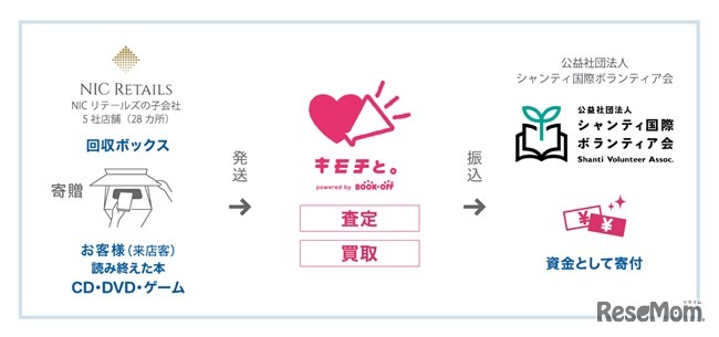 ブックオフは、不要な本やCD、DVD、ゲームを自社の宅配買取寄付サービス「キモチと。」を活用し、NICリテールズ運営の書店で回収。買取金額の全額をシャンティ国際ボランティア会を通じて寄付し、世界の子供の教育支援に活用する取組みを2022年4月25日より開始した。
