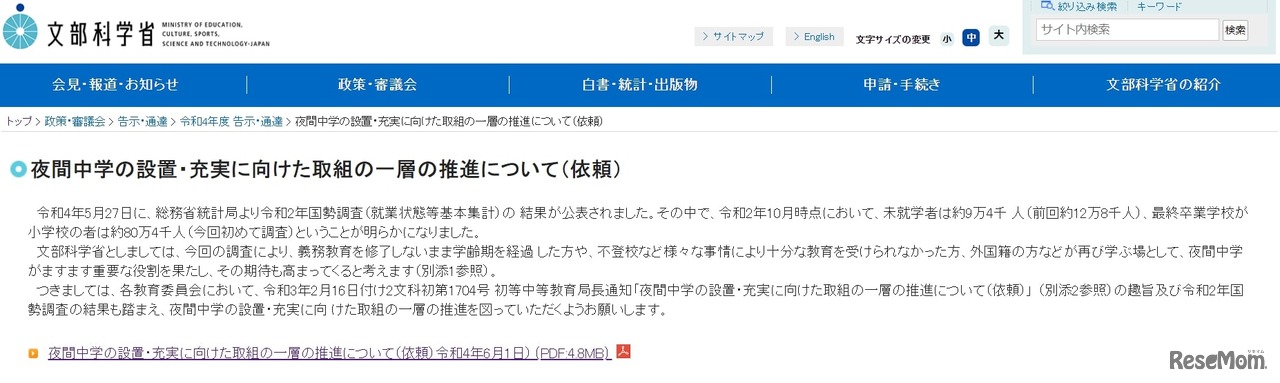 文部科学省は2022年6月1日、さまざまな事情により十分な教育を受けられなかった人や、外国籍の人が再び学ぶ場となる夜間中学の設置・充実に向けた取組みについて、より一層の推進を各教育委員会に依頼した。