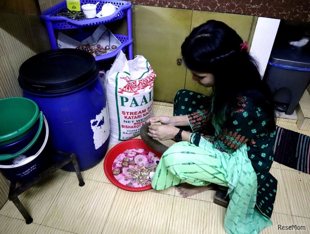 画像出典:シャプラニール=市民による海外協力の会 食事の支度を手伝う少女(野菜を切るようす)