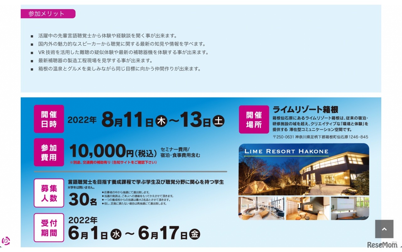 デンマークに本社を置く補聴器メーカー「オーティコン補聴器」は2022年8月11日~13日、言語聴覚士を目指す学生を対象とした「オーティコン補聴器みみともサマーキャンプ」を開催する。会場はライムリゾート箱根、参加費は1万円(宿泊・食費等含む)。申込みは6月17日まで。