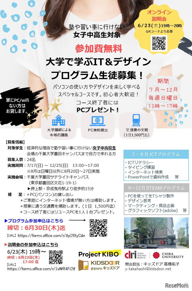キッズドアは2022年7月より、経済的理由でITを学ぶことが難しい女子中高生を対象に毎週日曜日にIT&デザインを学ぶ特別プログラムをスタートする。コース終了者にはリユースPCをプレゼント。プログラム開始に先駆け、6月23日にオンライン説明会を実施する。