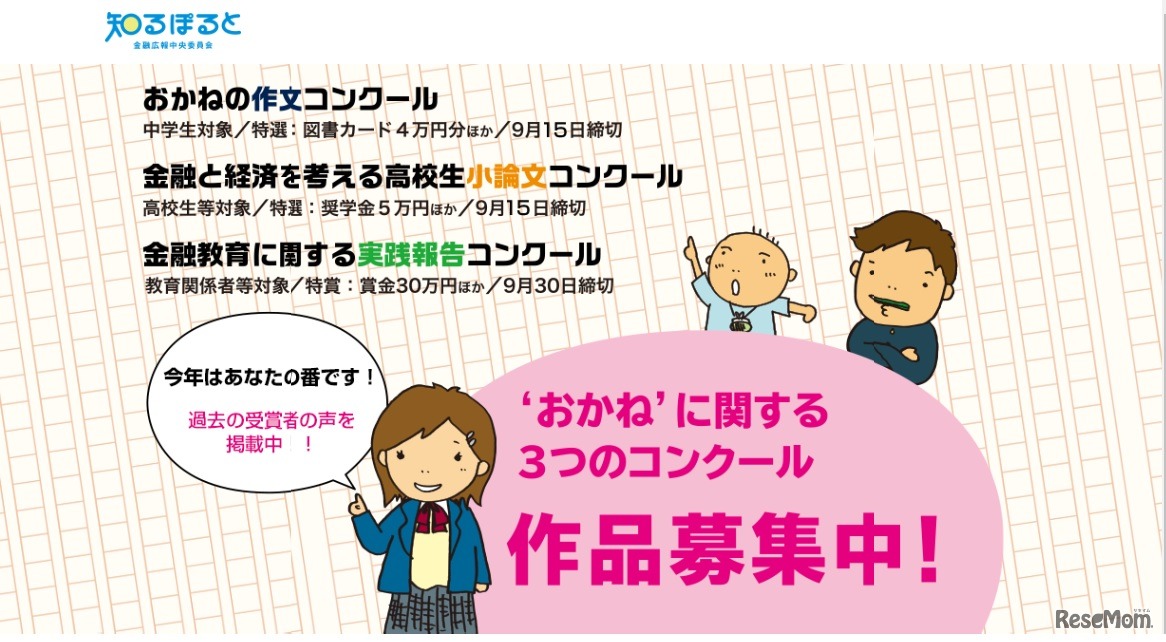 金融広報中央委員会は「おかね」に関する3つのコンクールを開催、作品を募集する。中学生は作文、高校生は小論文、教職を目指す大学生や教員等の教育関係者対象には金融教育に関する実践報告。応募締切は、中・高生作品は2022年9月15日、教育関係者作品は9月30日。