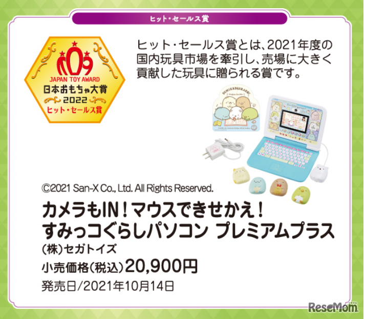 日本玩具協会は2022年6月14日、日本おもちゃ大賞2022を発表した。受賞は部門賞等39商品。2021年度国内玩具市場にもっとも貢献した玩具に贈られるヒット・セールス賞は「カメラもIN!マウスできせかえ!すみっコぐらしパソコンプレミアムプラス」。