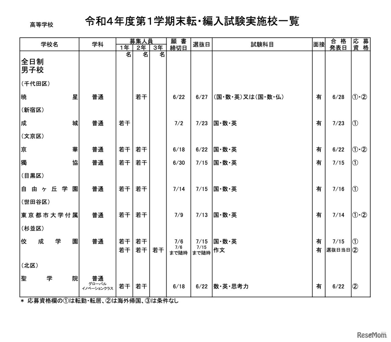 画像出典:東京都「令和4年度第1学期末転・編入試験実施校一覧」 私立高校(全日制)男子校