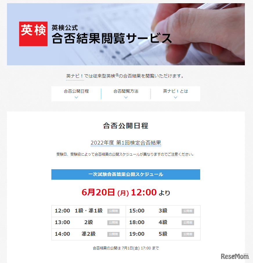 日本英語検定協会は2022年6月20日、Webサイトで「2022年度第1回一次試験」の合否結果閲覧サービスを開始する。団体責任者は午前11時以降、個人(英ナビ!会員)は正午から、級ごとに随時公開する。