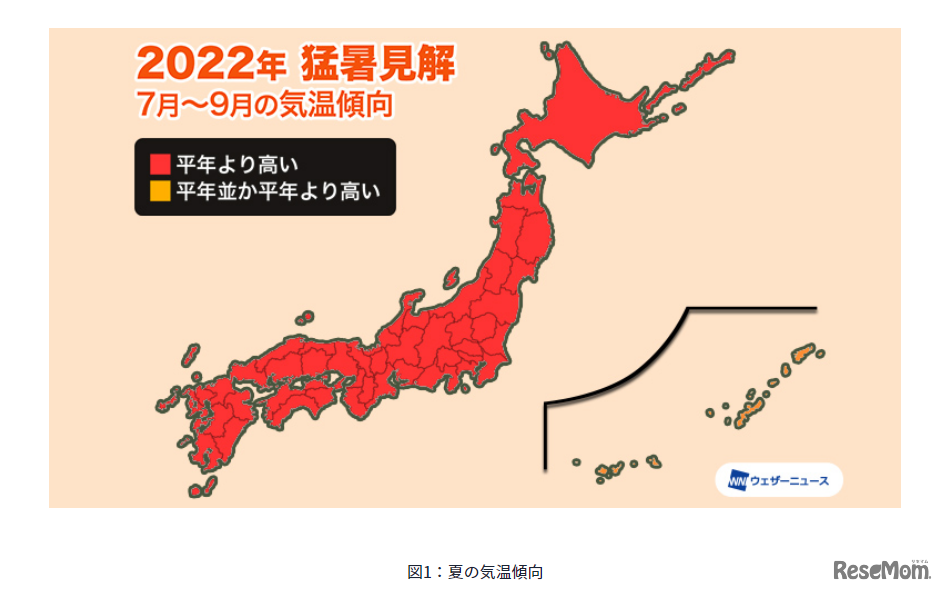 ウェザーニューズは2022年6月22日、「猛暑見解2022」を発表した。全国的に平年より暑く、2つの高気圧が重なるタイミングでは猛暑と予想される。暑さのピークは7月後半と8月後半、西日本と東日本では厳しい残暑となる見込み。
