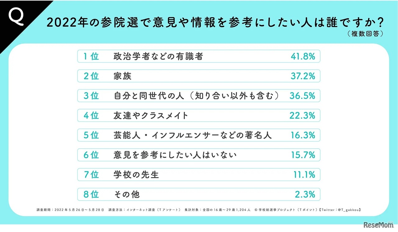 CCCマーケティングおよびTポイント・ジャパンは「学校総選挙プロジェクト」として、2022年5月26日~28日の3日間、全国の男女16歳~29歳を対象に「2022年度若者の政治意識調査」を実施し結果を公表した。