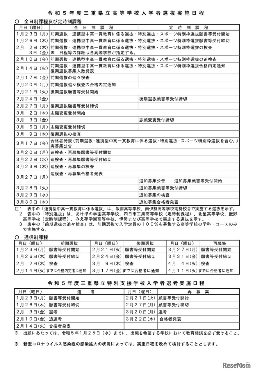 三重県教育委員会は2022年6月25日、2023年度(令和5年度)三重県立高等学校入学者選抜と三重県立特別支援学校入学者選考の実施日程を公表した。県立高校の前期選抜の検査は2023年2月2日・3日、後期選抜の検査は3月9日に行われる。