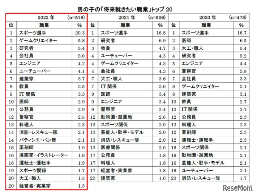 クラレは2022年7月7日、今春小学校を卒業した子供とその親を対象にした「将来就きたい職業」と「就かせたい職業」のアンケート結果を公表した。将来就きたい職業の総合順位は、前年に続き「スポーツ選手」が1位となった。