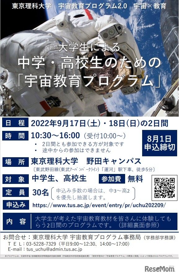東京理科大学は2022年9月17日・18日、中高生向けに「大学生による中学・高校生のための『宇宙教育プログラム』」を、東京理科大学野田キャンパスで開催する。大学生が講師を務め、遠隔探査ロボット等を使った宇宙教育教材が体験できる。参加費無料。