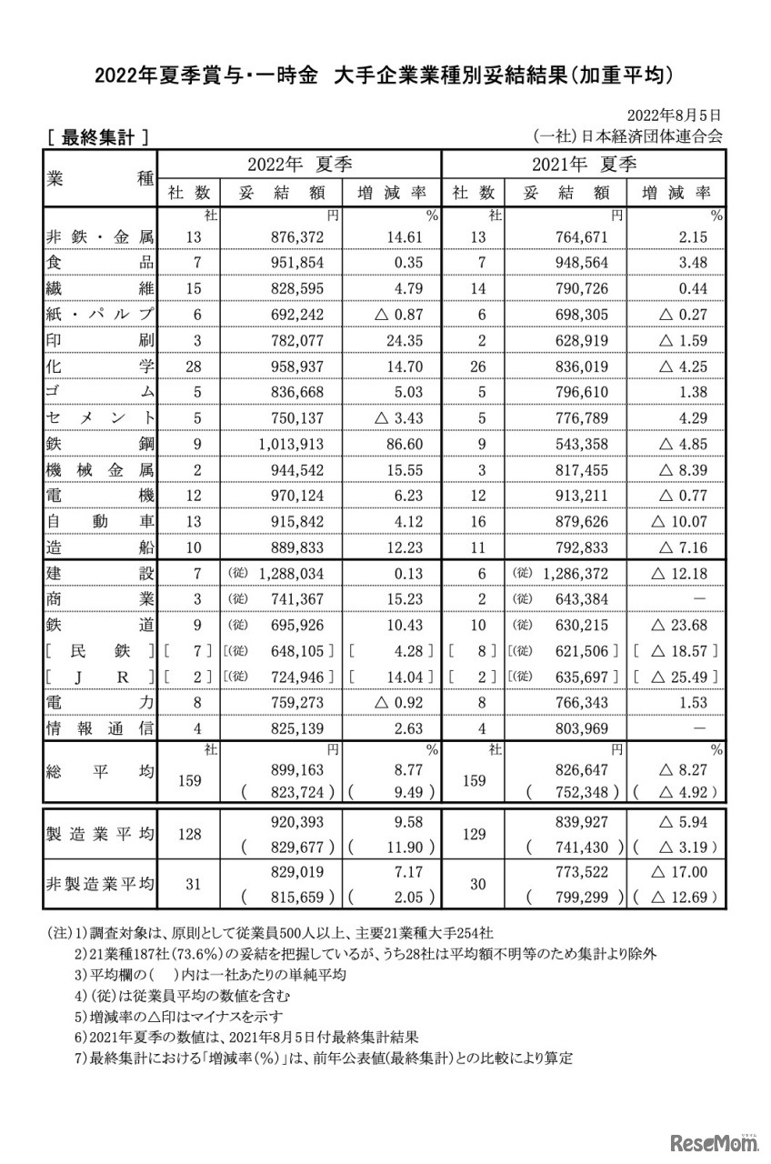 日本経済団体連合会(経団連)は2022年8月5日、「2022年夏季賞与・一時金 大手企業業種別妥結結果(加重平均)最終集計」を公表した。大手企業の夏のボーナス平均妥結額は、前年(2021年)比8.77%増の89万9,163円。