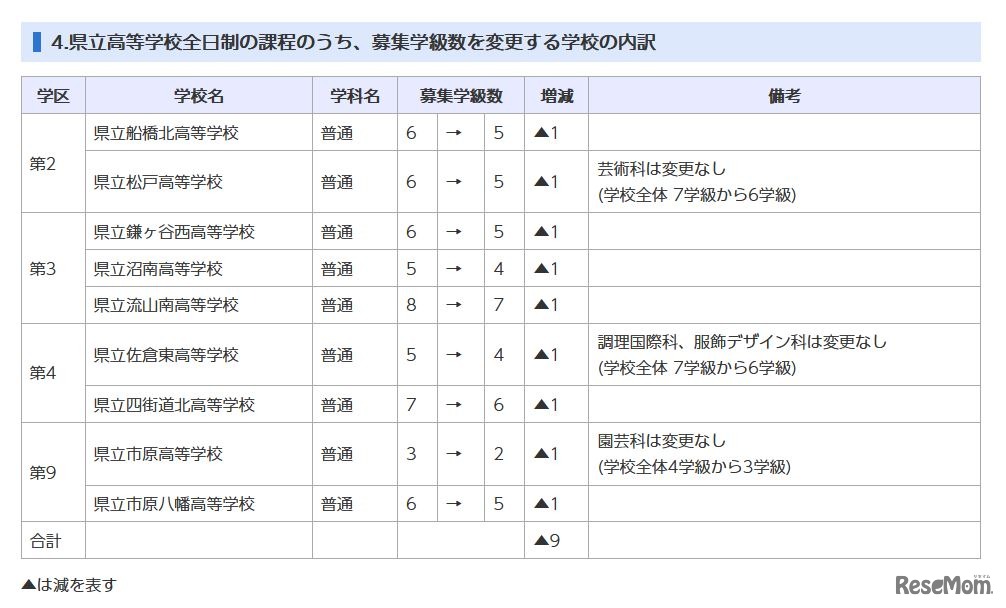 画像出典:千葉県教育委員会 県立高等学校全日制の課程のうち、募集学級数を変更する学校の内訳