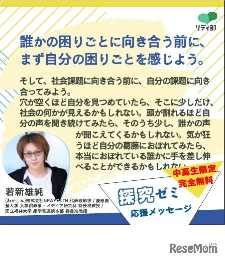 Ridilover(リディラバ)は、中高生を対象にした「探究ゼミ」を2022年9月4日に開講する。社会課題を学び、話し、自分や社会の未来、社会問題の解決策を考える。参加費無料。応募締切8月31日。