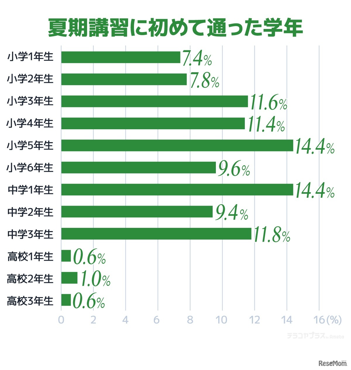 夏期講習に初めて通った学年は小学5年生と中学1年生がもっとも多く、全体の62.2%が小学生の時に夏期講習デビューを果たしていることが、CyberOwl(サイバーアウル)が実施した調査で明らかになった。平均費用や参加して良かった点等も調査している。