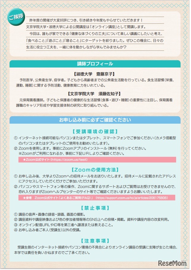 文京学院大学は淑徳大学と共に、「文京学院大学・淑徳大学共催公開講座」を、2022年10月1日・22日にオンライン(Zoom)開催する。「心と身体(からだ) 食う・寝る・遊ぶ」をテーマに講義を行う。参加費無料。両日セット、先着100名限定。