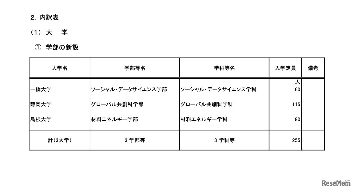 画像出典:文部科学省「令和5年度 国立大学の入学定員(予定)について」 学部の新設