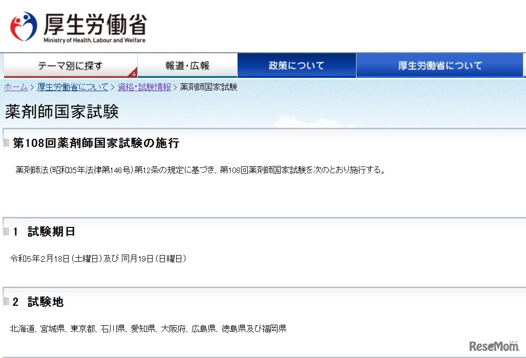 厚生労働省は2022年8月31日、第108回薬剤師国家試験について発表した。試験は2023年2月18日と19日に、北海道、宮城県、東京都、石川県、愛知県、大阪府、広島県、徳島県、福岡県の各試験地にて実施する。合格発表は2023年3月22日。