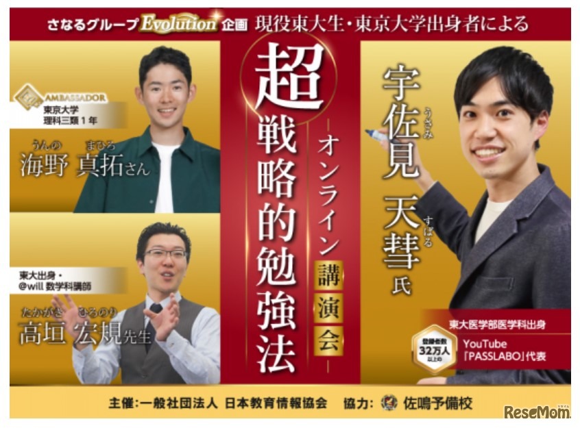 佐鳴予備校は2022年9月19日、東京大学・京都大学・医学部医学科等の最難関大学を目指す中3・高1・高2生徒を対象に「現役東大生・東京大学出身者によるオンライン講演会 超戦略的勉強法」を開催する。参加無料。事前申込制。