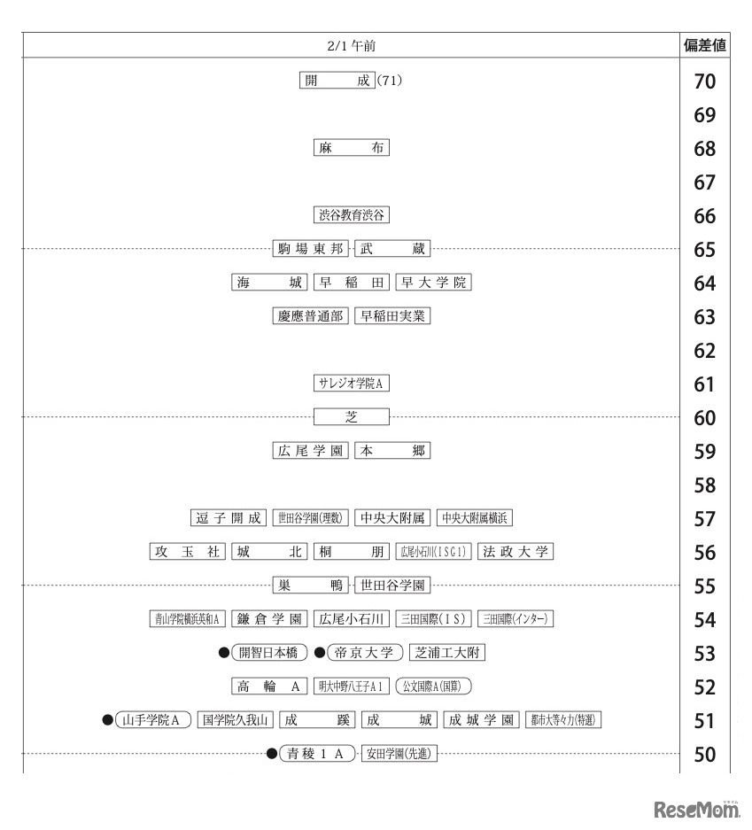 画像出典:四谷大塚 「第2回合不合判定テスト」偏差値一覧(2月1日午前)【男子】