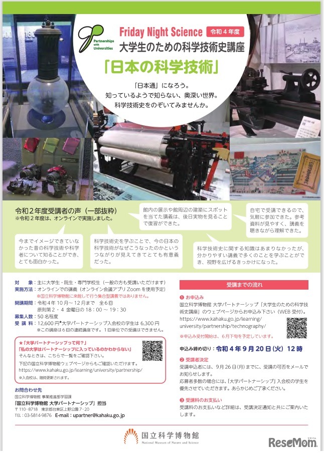 国立科学博物館は2022年10月から12月までの第2・第4金曜日、おもに大学生・大学院生・専門学校生対象に「Friday Night Science大学生のための科学技術史講座『日本の科学技術』」全6回をオンラインで開催、受講者を募集する。受講料1万2,600円。申込締切9月20日。