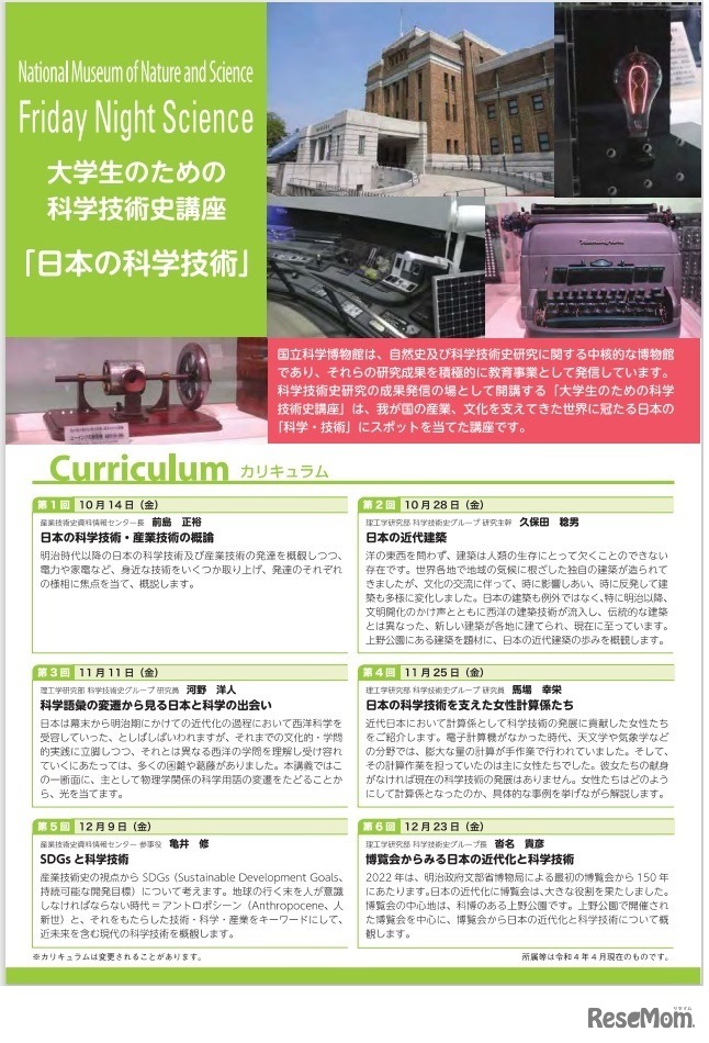 国立科学博物館は2022年10月から12月までの第2・第4金曜日、おもに大学生・大学院生・専門学校生対象に「Friday Night Science大学生のための科学技術史講座『日本の科学技術』」全6回をオンラインで開催、受講者を募集する。受講料1万2,600円。申込締切9月20日。