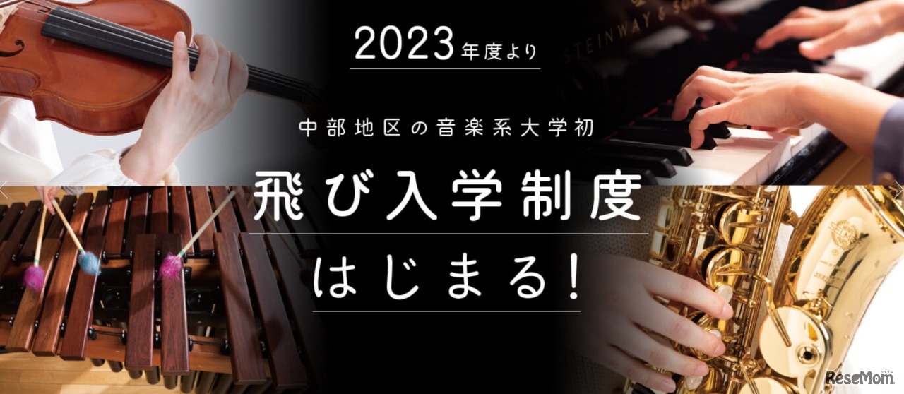 名古屋音楽大学は2023年度選抜試験より、中部地区の音楽系大学として初、全国の音楽大学でも4番目となる「飛び入学制度」を導入。対象は現高校2年生で国内外のコンクールにおいて顕著な実績を有する者。出願期間は2023年1月5日~20日。書類、実技、面接にて選考を行う。
