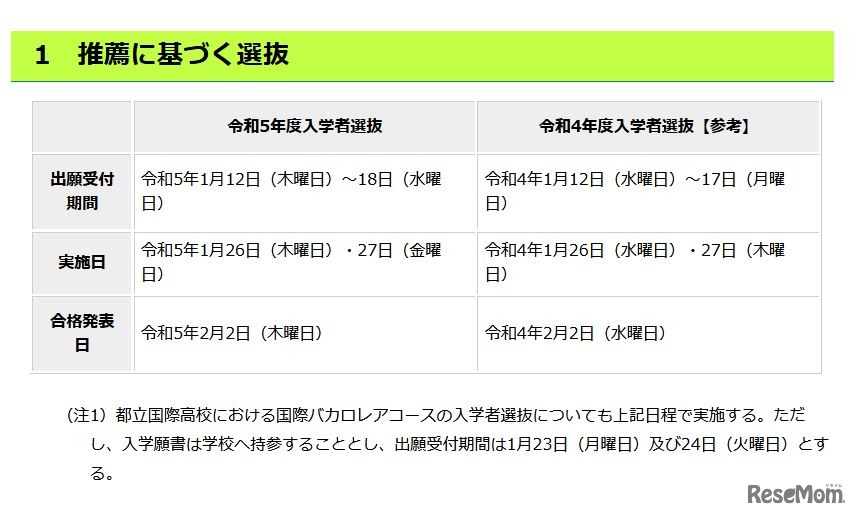 画像出典:東京都教育委員会 推薦に基づく選抜の日程