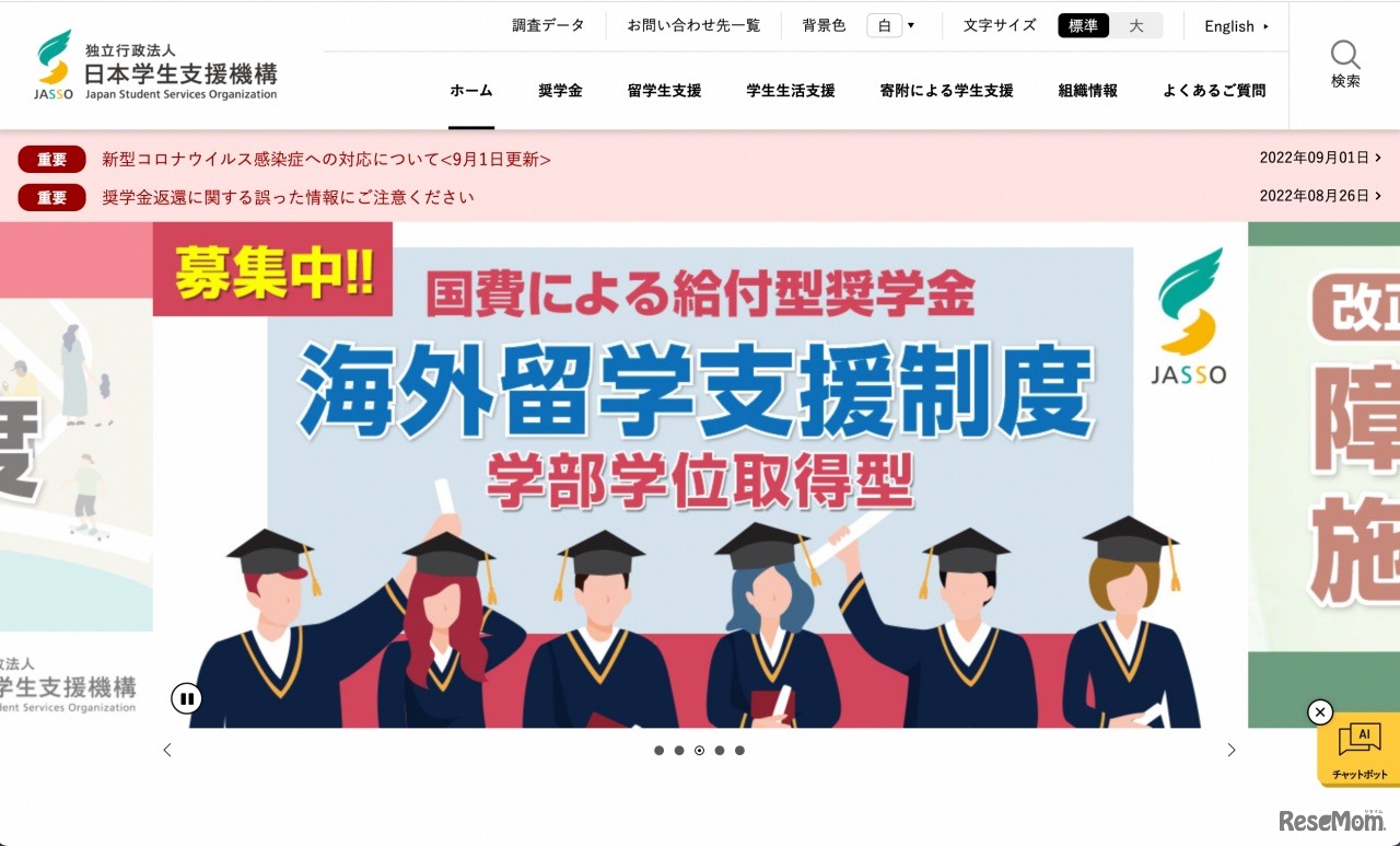 日本学生支援機構(JASSO)は2022年9月1日、Webサイト内の「新型コロナウイルス感染症への対応について」を更新。休学中の学生・生徒と、最高学年でやむを得ず卒業延期となった学生・生徒に向けた奨学金情報を更新した。