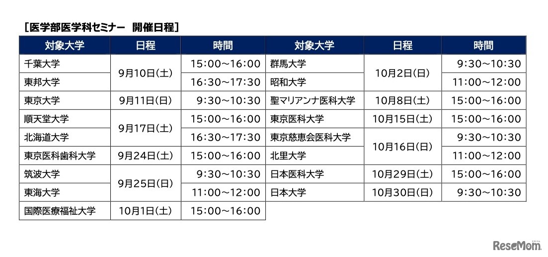 河合塾麹町校(医学部進学専門特化校舎)は、2022年9月中旬~10月末にかけて、将来の医学部進学をめざす中高生、保護者を対象とした大学別の医学部医学科セミナーを全17回(17校)にわたり開催する。参加無料、申込みは河合塾Webサイトで受け付ける。