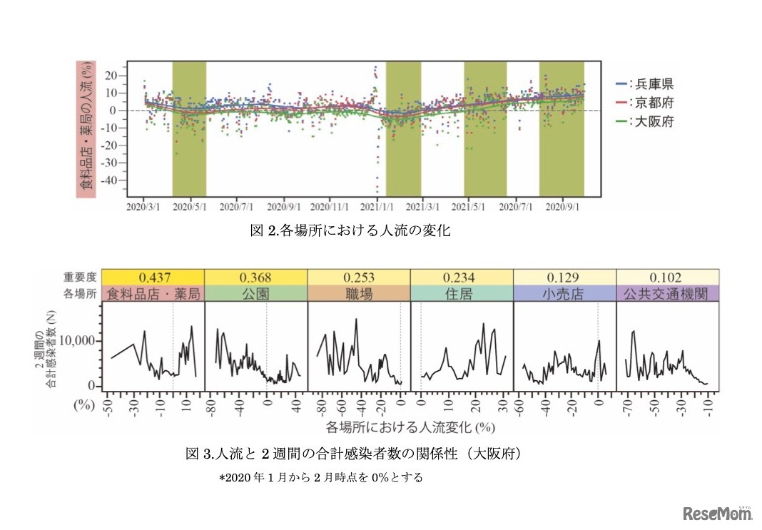 新型コロナ感染者数と日常生活における移動距離、および公共交通機関における人流との関係性は弱く、感染者数を増やさないためには、食料品店・薬局の人流を抑制することが重要であるとして、大阪公立大学の研究グループが研究成果を発表した。