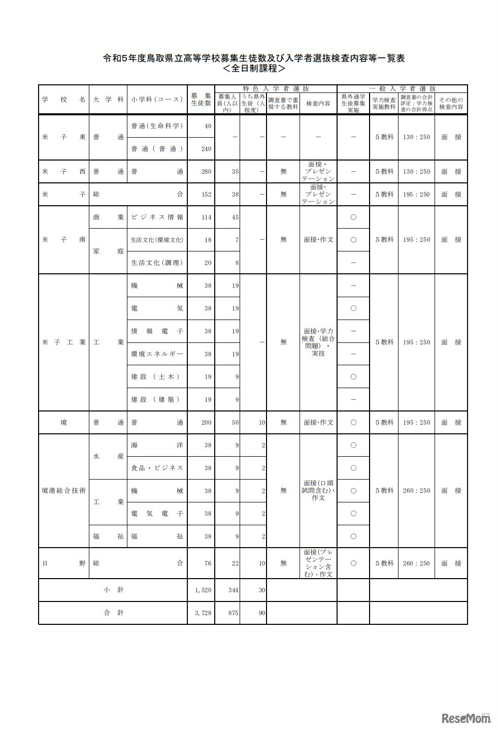 令和5年度鳥取県立高等学校募集生徒数および入学者選抜検査内容等一覧表