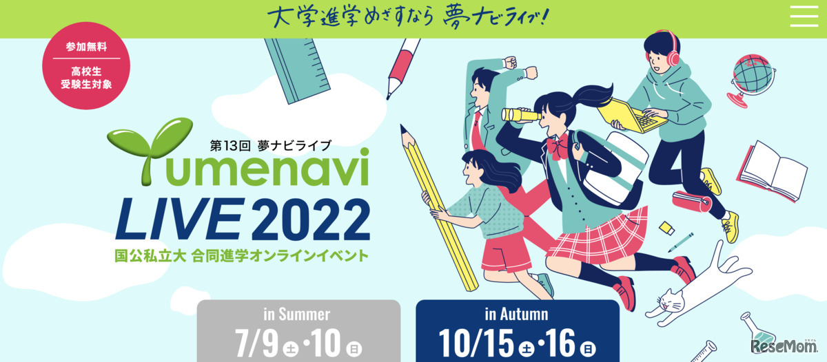 フロムページは、大学進学を目指す高校生・受験生を対象にした227校による国公私立大合同進学オンラインイベント「夢ナビライブ2022 in Autumn」を2022年10月15日・16日に開催する。参加無料。
