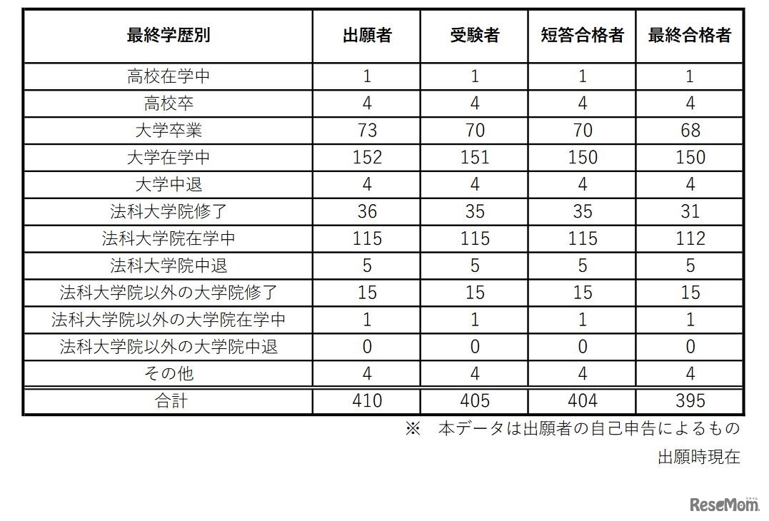 法務省は2022年9月6日午後4時、令和4年司法試験の合格発表を行った。最終合格者数は1,403人で、2021年の1,421人と比べて18人減少した。受験者数3,082人に対する合格率は45.52%。合格者数と合格率を法科大学院別にみると、1位はいずれも「予備試験合格者」だった。