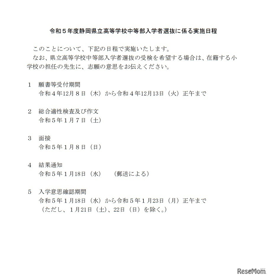 令和5年度静岡県立高等学校中等部入学者選抜に係る実施日程