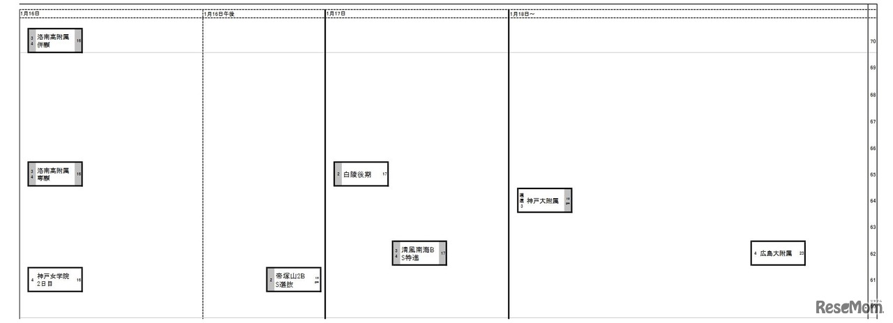 日能研は2022年9月5日、「2023年入試 予想R4偏差値一覧」の首都圏8月18日版、関西9月1日版を公開した。合格可能性80%ラインの偏差値は、開成(72)、筑波大駒場(72)、灘(71)、桜蔭(67)、女子学院(67)等。