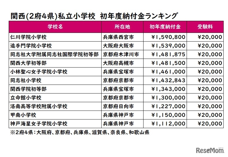 関西(2府4県)私立小学校 初年度納付金ランキング