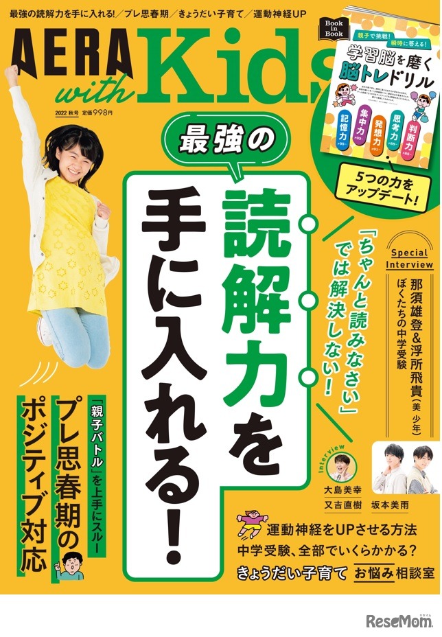 朝日新聞出版は小学生や未就学児を持つママ・パパの子育て情報誌「AERA with Kids 2022年秋号」を、2022年9月5日に発売した。大特集「最強の読解力を手に入れる」と「美 少年」メンバーが振り返る中学受験、森三中・大島美幸の子育てインタビュー。定価998円(税込)。