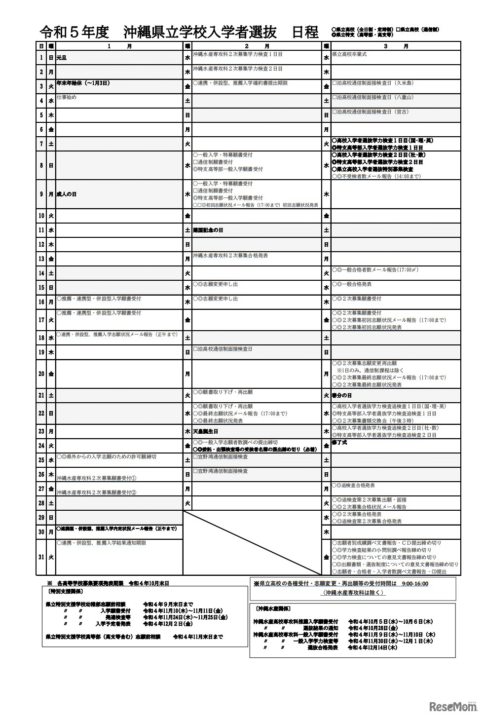 沖縄県教育委員会は、2023年度(令和5年度)県立高等学校入学者選抜に係る実施要項・日程・入学定員等を公表した。一般入学の学力検査・面接等は2023年3月7日と8日に行われる。