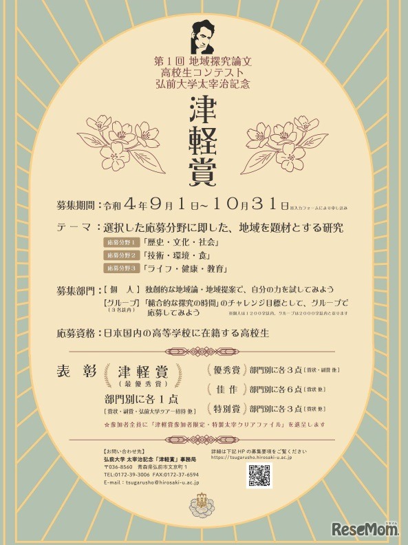 弘前大学は2022年10月31日まで、太宰治記念「津軽賞」第1回地域探究論文高校生コンテストの応募を受け付けている。自らの地域についてオリジナルな視点で研究し、既定の字数以内で表現した小論文を募集する。
