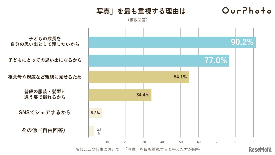 七五三行事においてもっとも重視するものは「写真」71.8%で、写真撮影の実施日は、70.2%の人が「参拝当日のみ」と回答していることが、OurPhotoが2022年9月5日に発表した調査結果より明らかになった。