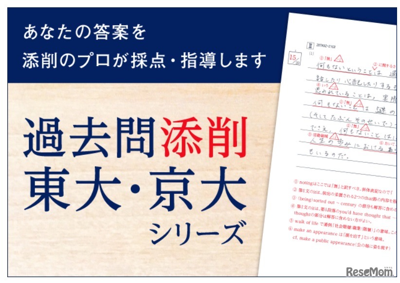 Z会は2022年9月1日、通信教育の大学受験生向けコースで、「特講」過去問添削の東大・京大シリーズの「最新年度セット(2022)」の申込受付を開始した。答案はスマートフォンで撮影して提出するだけなので、ポストを探す手間もかからず、切手代もかからず便利だという。