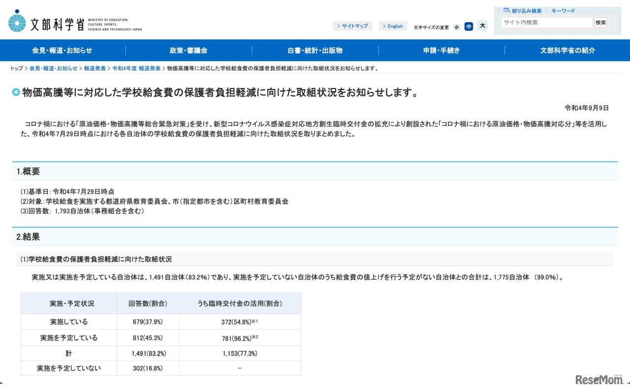 文部科学省は2022年9月9日、物価高騰等に対応した学校給食費の保護者負担軽減に向けた取組状況について公表した。学校給食費の保護者負担軽減を実施または実施予定の自治体は83.2%にのぼり、うち臨時交付金を活用または活用予定の自治体は77.3%だった。
