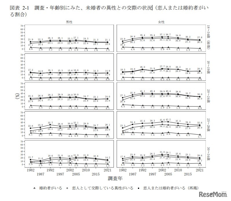 画像出典:国立社会保障・人口問題研究所 年齢別にみた、未婚者の異性との交際の状況(恋人または婚約者がいる割合)