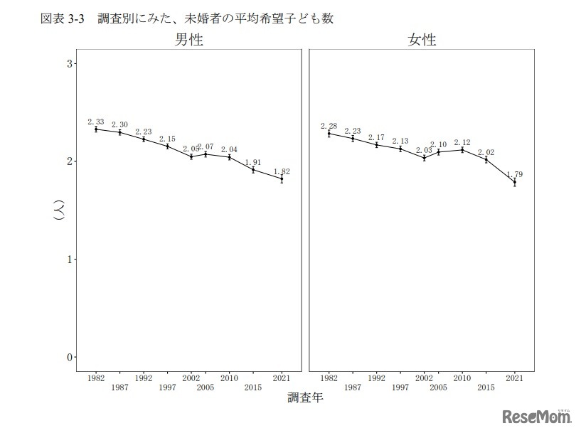 画像出典:国立社会保障・人口問題研究所 調査別にみた、未婚者の平均希望子供数