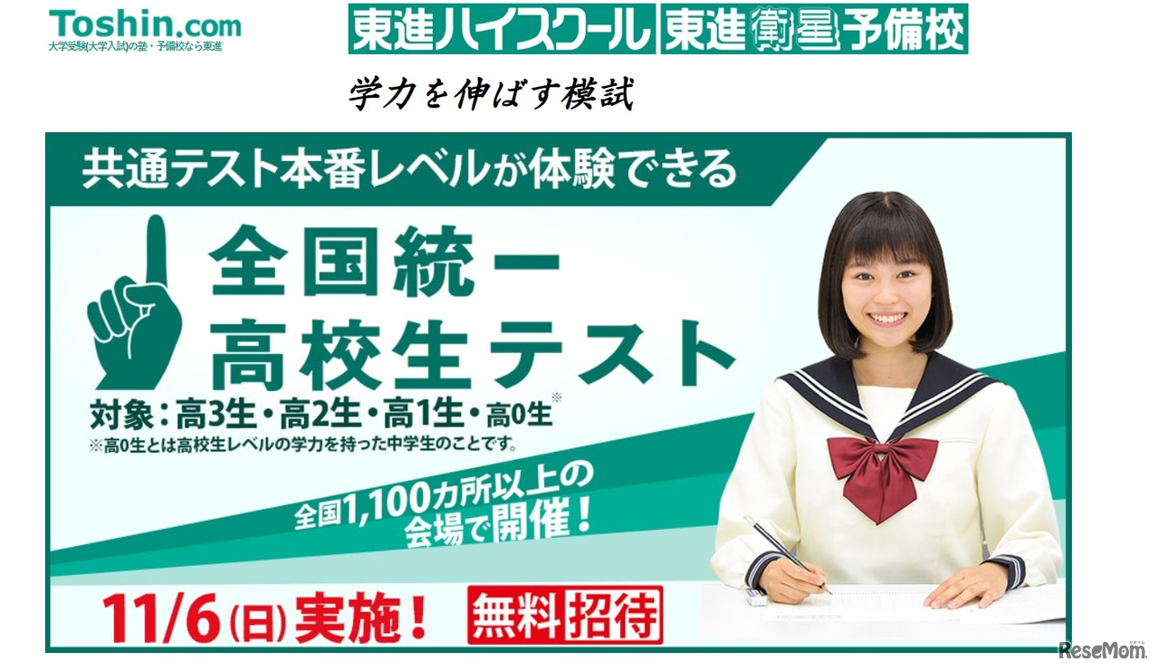 東進は2022年11月6日、高校生を対象とした「全国統一高校生テスト」を実施する。高校3年生は大学入学共通テストの本番レベルが体験できる。全国1,100か所以上の会場で開催し、参加は無料。