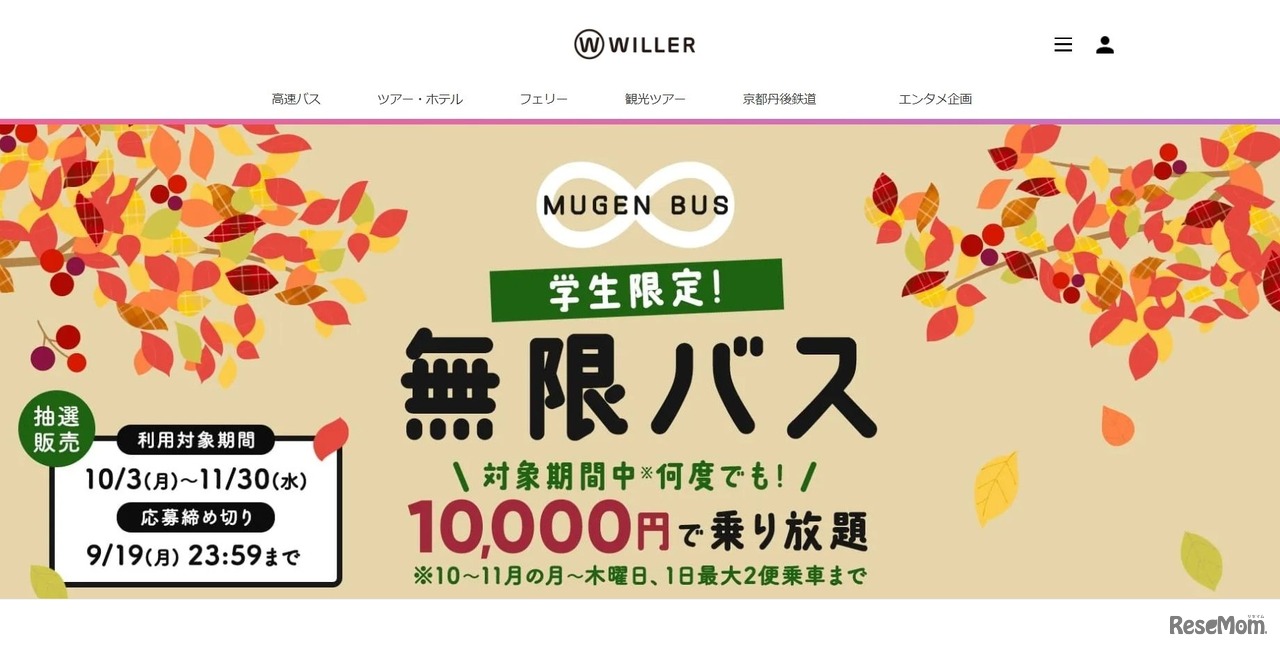 WILLER EXPRESSは、2022年10月3日~11月30日の約2か月間、高速バス「WILLER EXPRESS」の全国16路線が乗り放題となる「学生限定!無限バス」の抽選販売を開始した。限定100名。