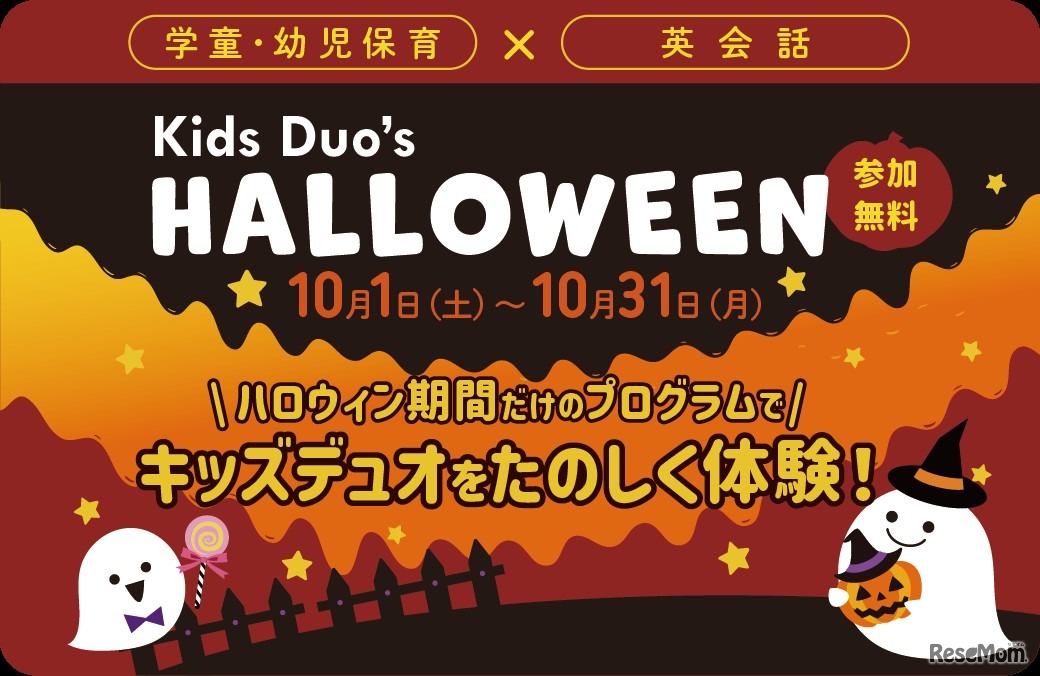 やる気スイッチグループが展開する英語で預かる学童保育「Kids Duo(キッズデュオ)」は、幼児(3歳~6歳)と小学生(小学校1~4年生)を対象に、Kids Duoが無料体験できる毎年人気のプログラム「Kids Duo’s HALLOWEEN」を10月に期間限定で開催する。参加無料。