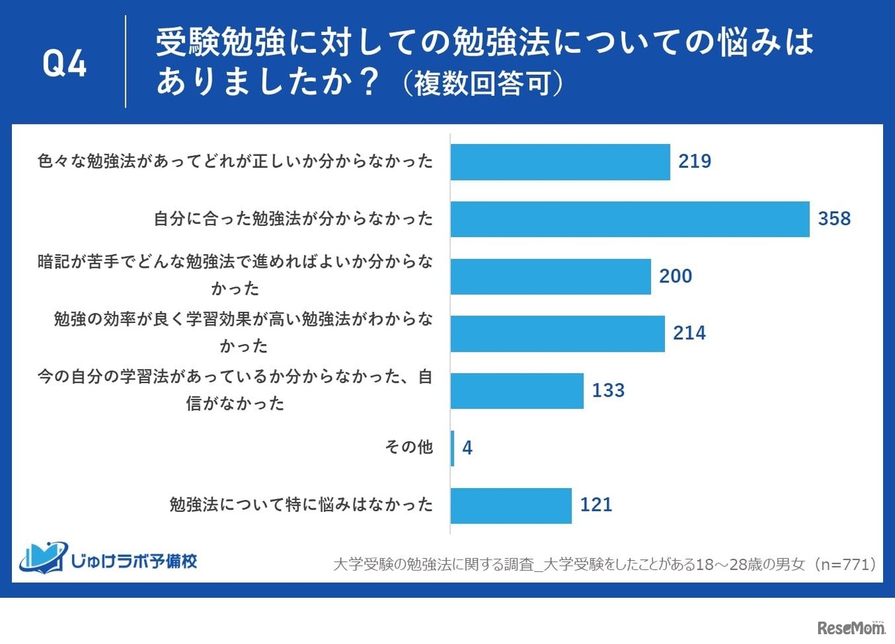 大学受験の参考書選びで失敗したり悩んだりした原因は「自分に合う、必要な教材の選び方がわからなかった」と答えた人が過半数に達することが、大学受験をしたことがある18~28歳を対象に実施したじゅけラボ予備校によるアンケートより明らかになった。
